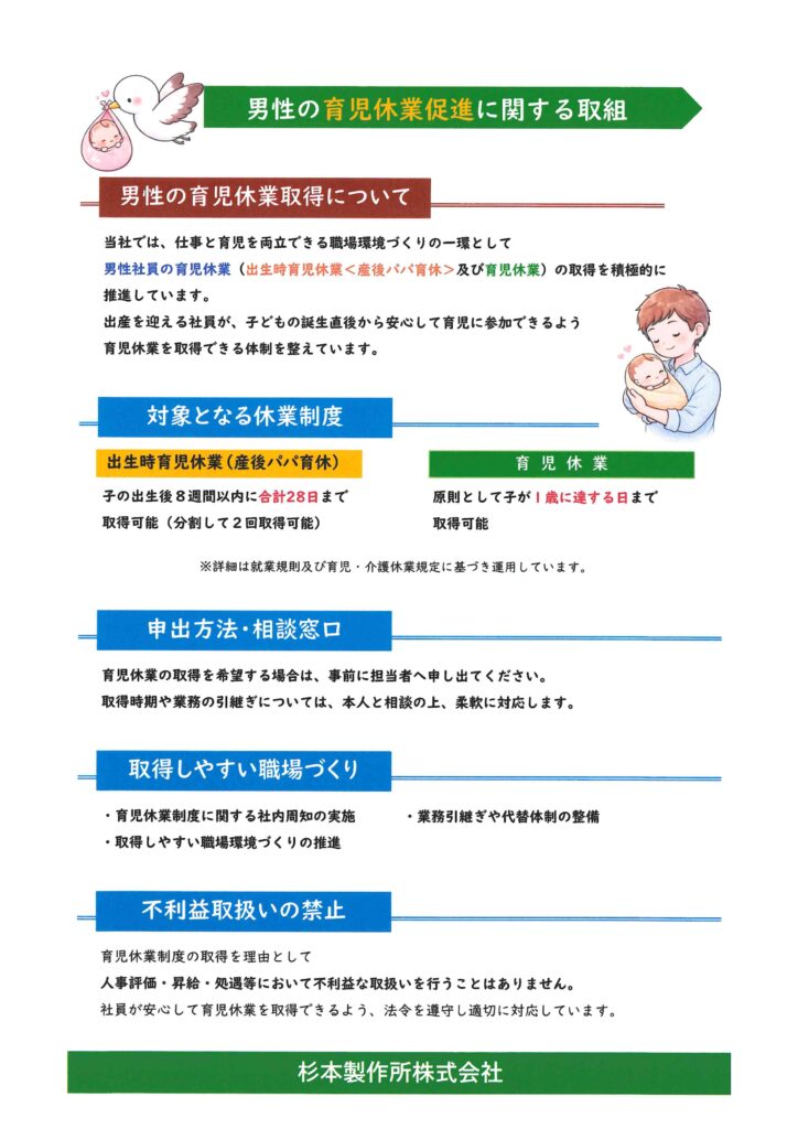 2026.2.6 お知らせ 男性の育児休暇取得を応援しています! 杉本製作所株式会社では、令和7年11月1日に男性の育児休業促進に関する行動計画を策定しました。 男性社員も安心して育児休業(産後パパ育休を含む)を取得できる環境づくりに取り組んでいます。 制度の紹介は下記をご覧ください。 Tweet Pocket